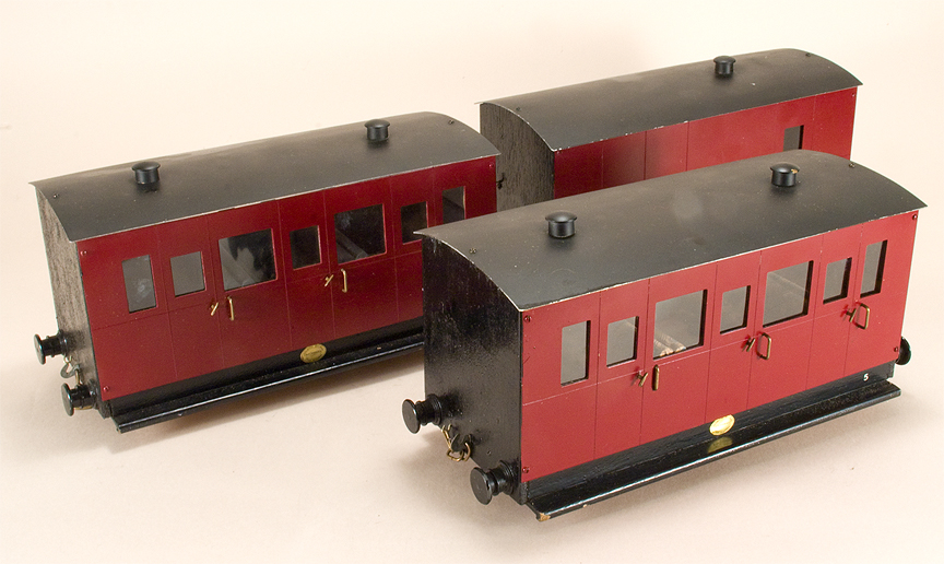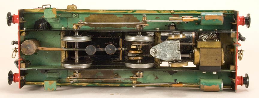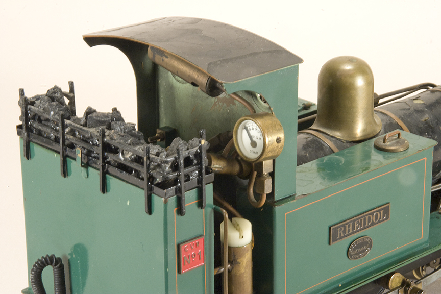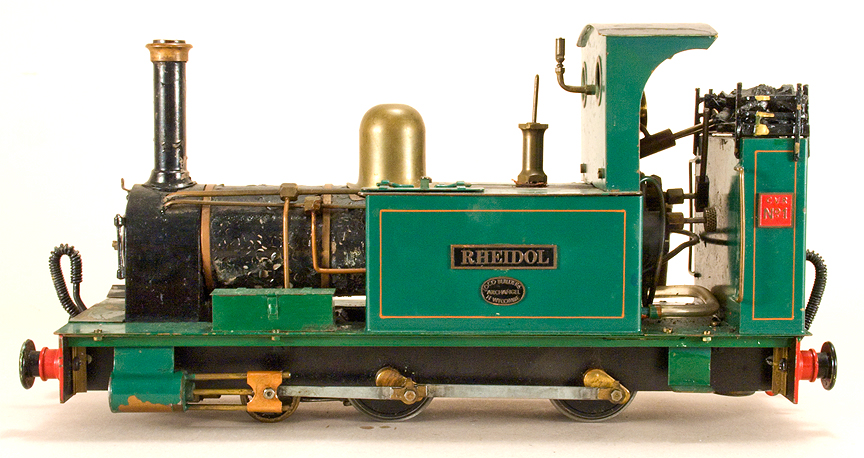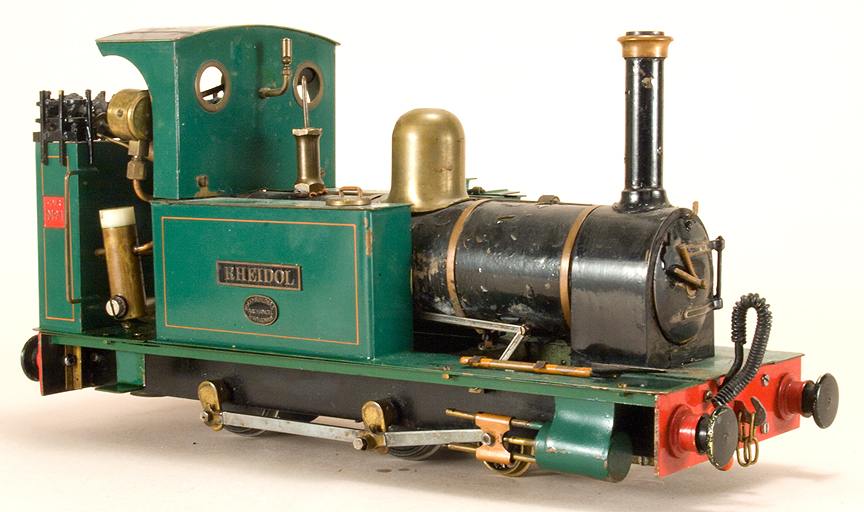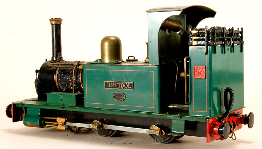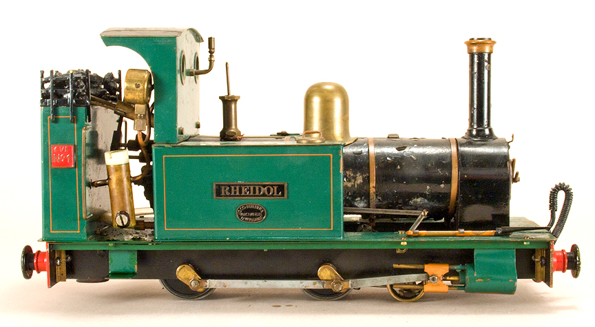 | 0 gauge, 16mm scale. Meths fired, single cylinder, slip eccentric, good running condition, rough paint on boiler. Internally fired boiler, functional side tanks. Pump in one tank. Includes three Archangel VoR coaches, all in nice condition. Click here for more info. | ||||||||||||